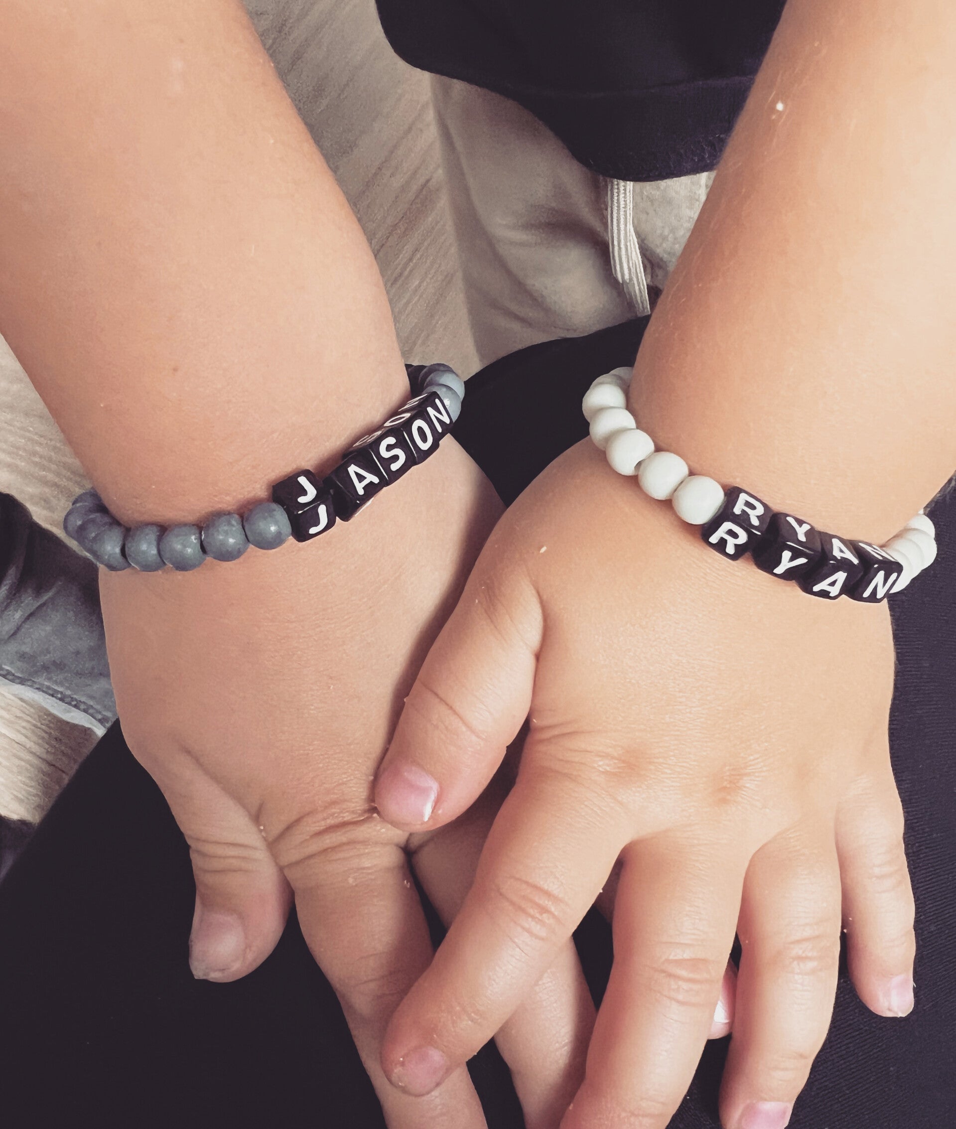 Gemaakt van 4mm kralen met zwart-witte letterkralen. Er zijn verschillende kleuren mogelijk