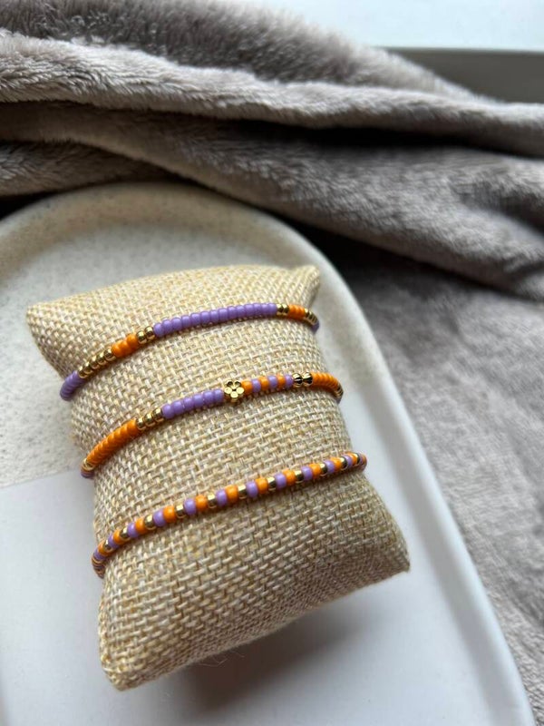 Dit vrolijke setje is een combinatie van drie Mikyuki armbandjes in de kleuren paars , oranje gecombineerd met gouden kraaltjes. Een armandje heeft een super schattig bloemetje in het midden 🌸