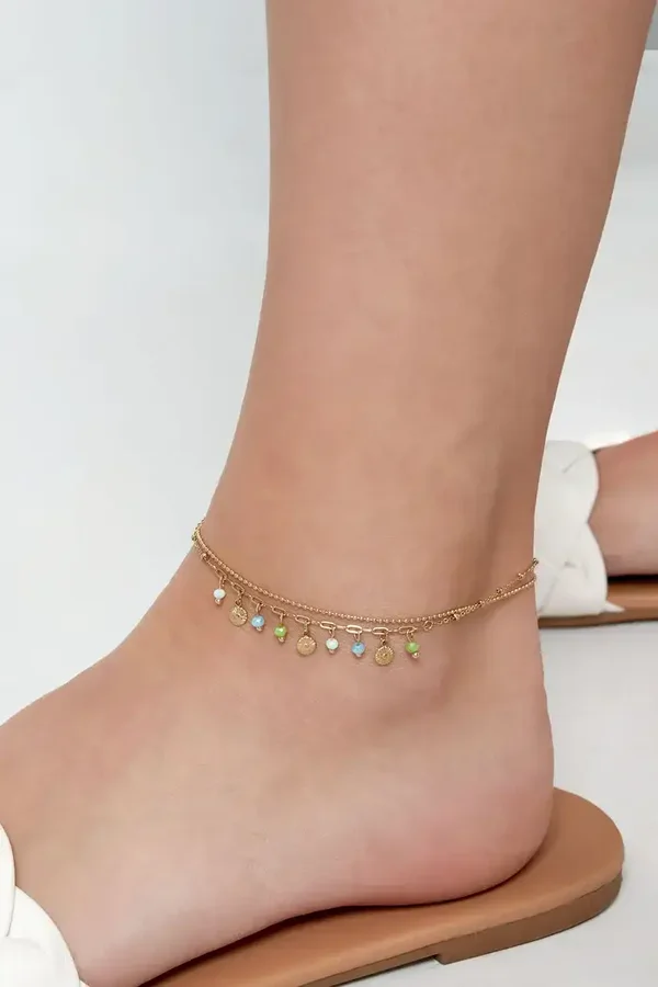 Super tof gouden enkelbandje gemaakt van stainless steel. Super leuk met de gekleurde groene, blauwe en witte bolletjes! En extra leuk details: het is een dubbel enkelbandje, dus met twee kettinkjes!