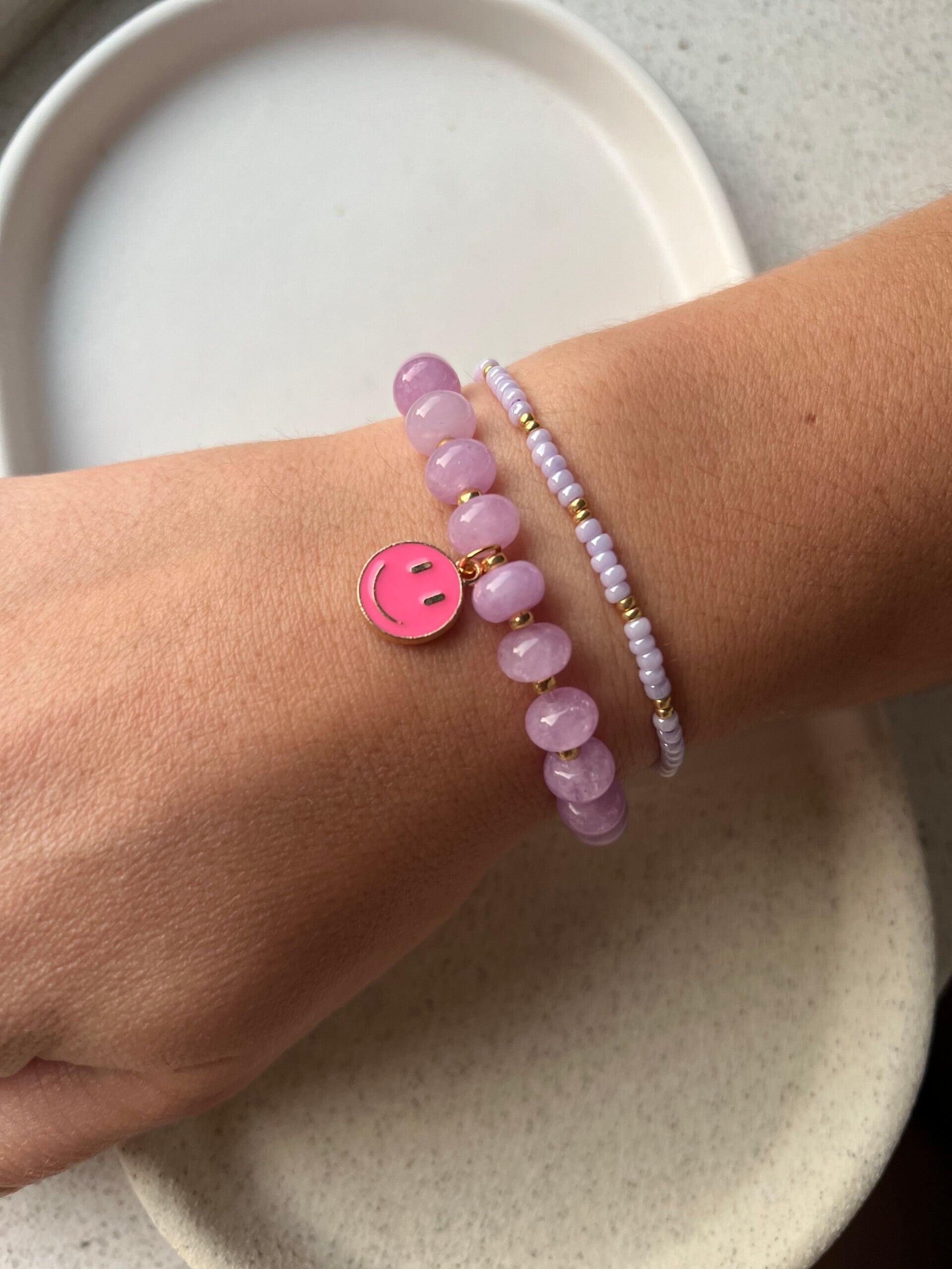 OMG hoe tof is deze lila armband met mooie natuursteen kralen afgewerkt met een vrolijke smiley.