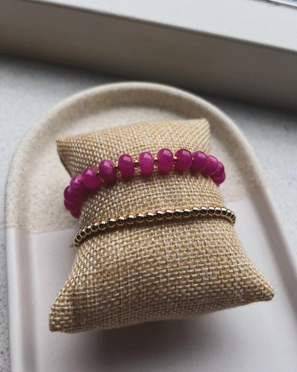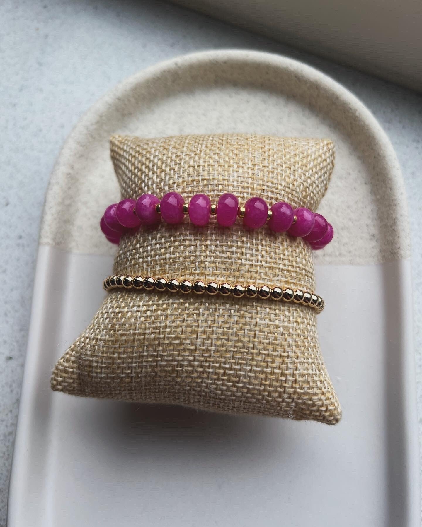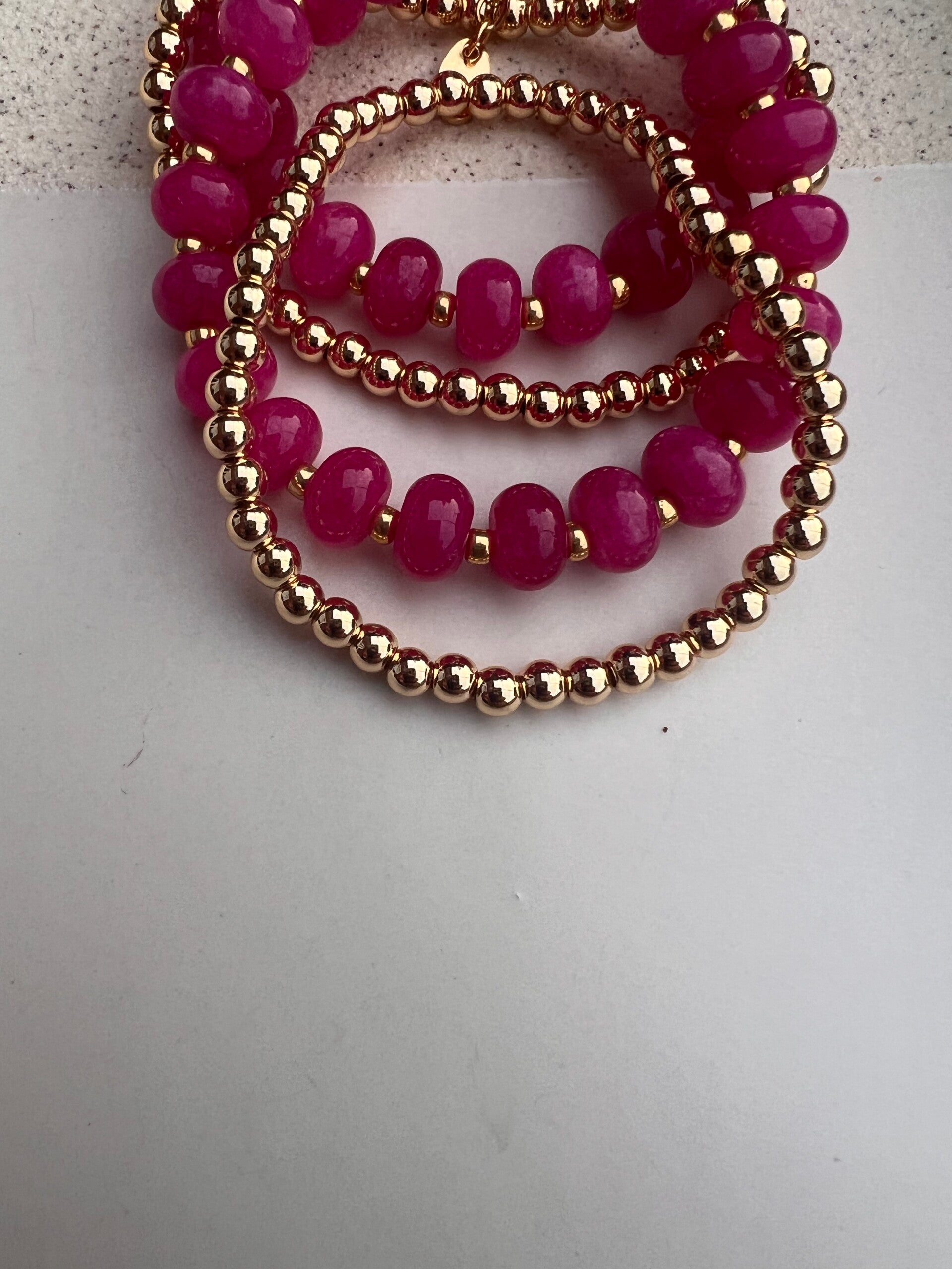 Mooie fuchsia kleurige armband met natuursteen kralen icm gouden Miyuki kraaltjes. Echt een zomers kleurtje, en helemaal hip!