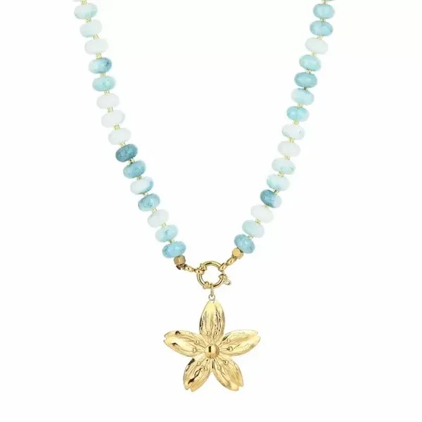 Helemaal leuk deze kralen ketting met in blauw tinten met grote bloem.